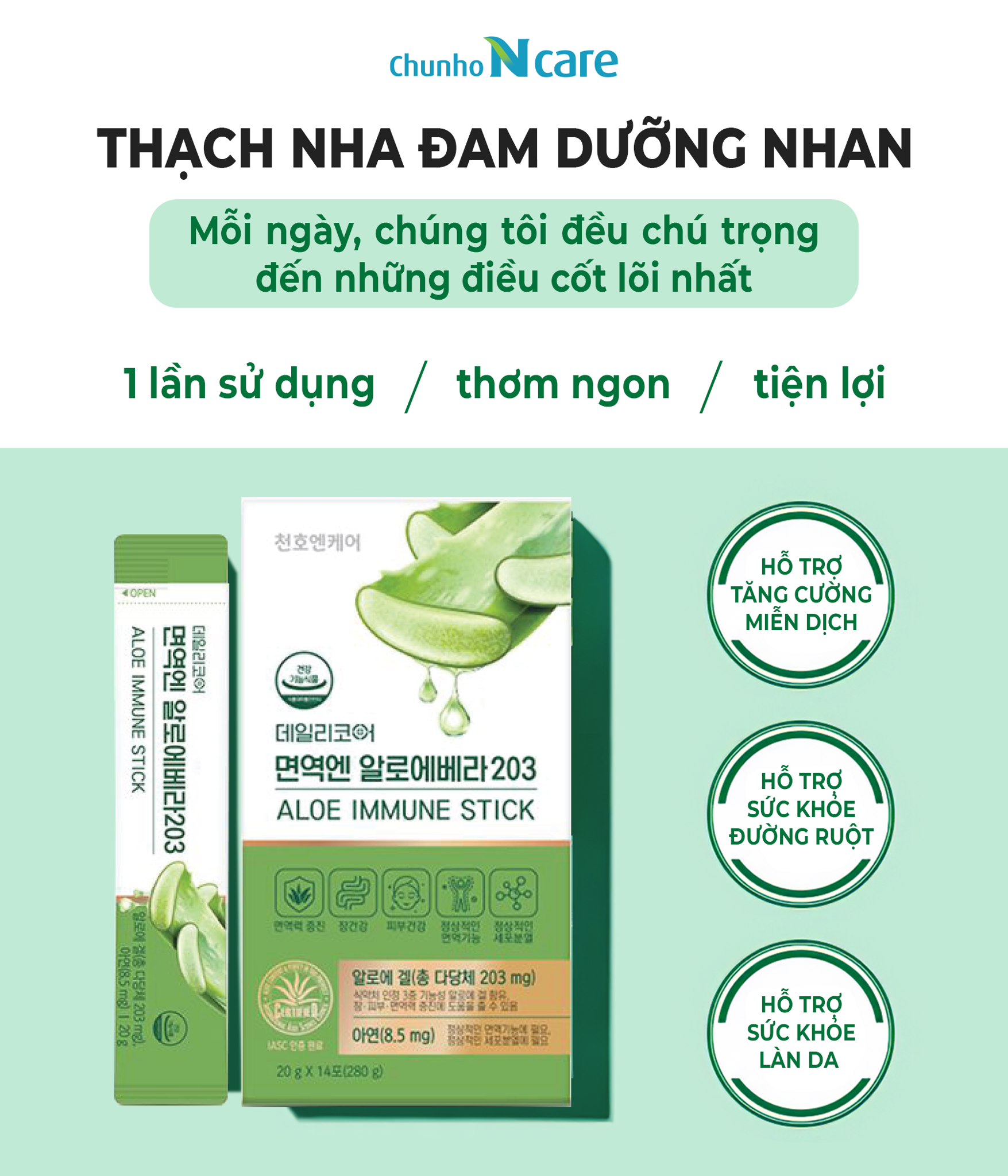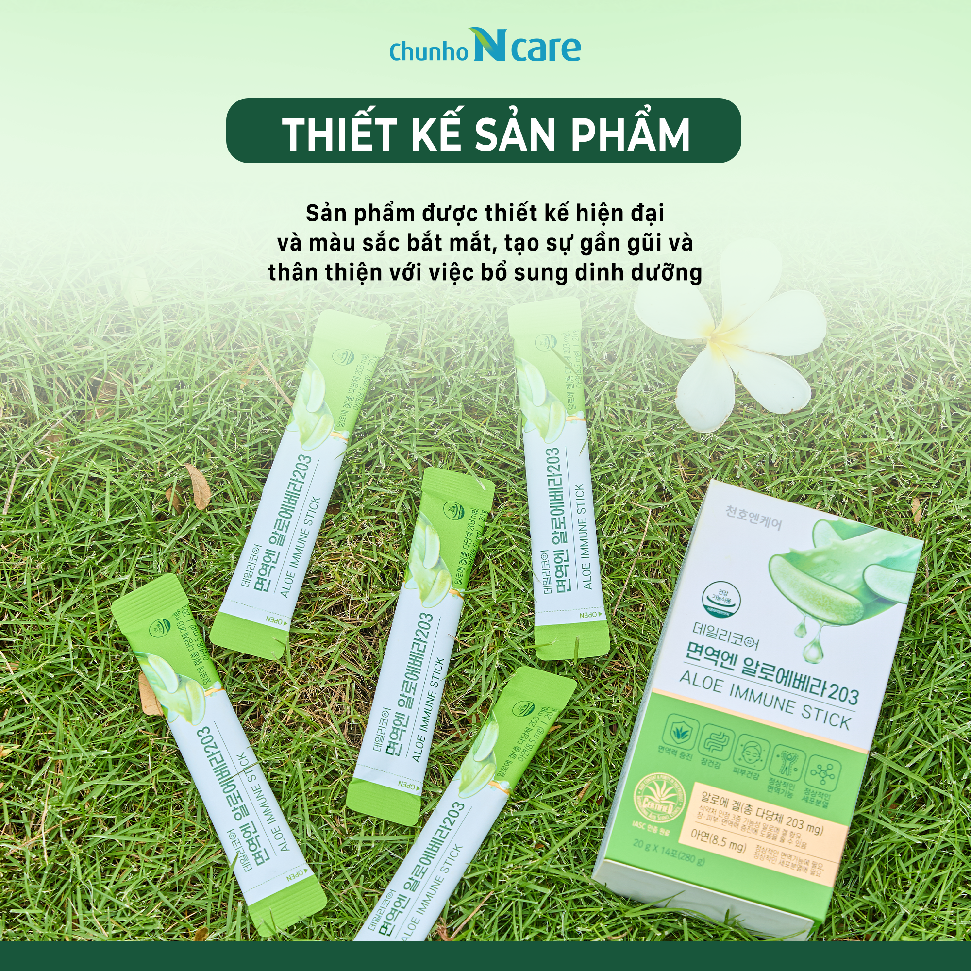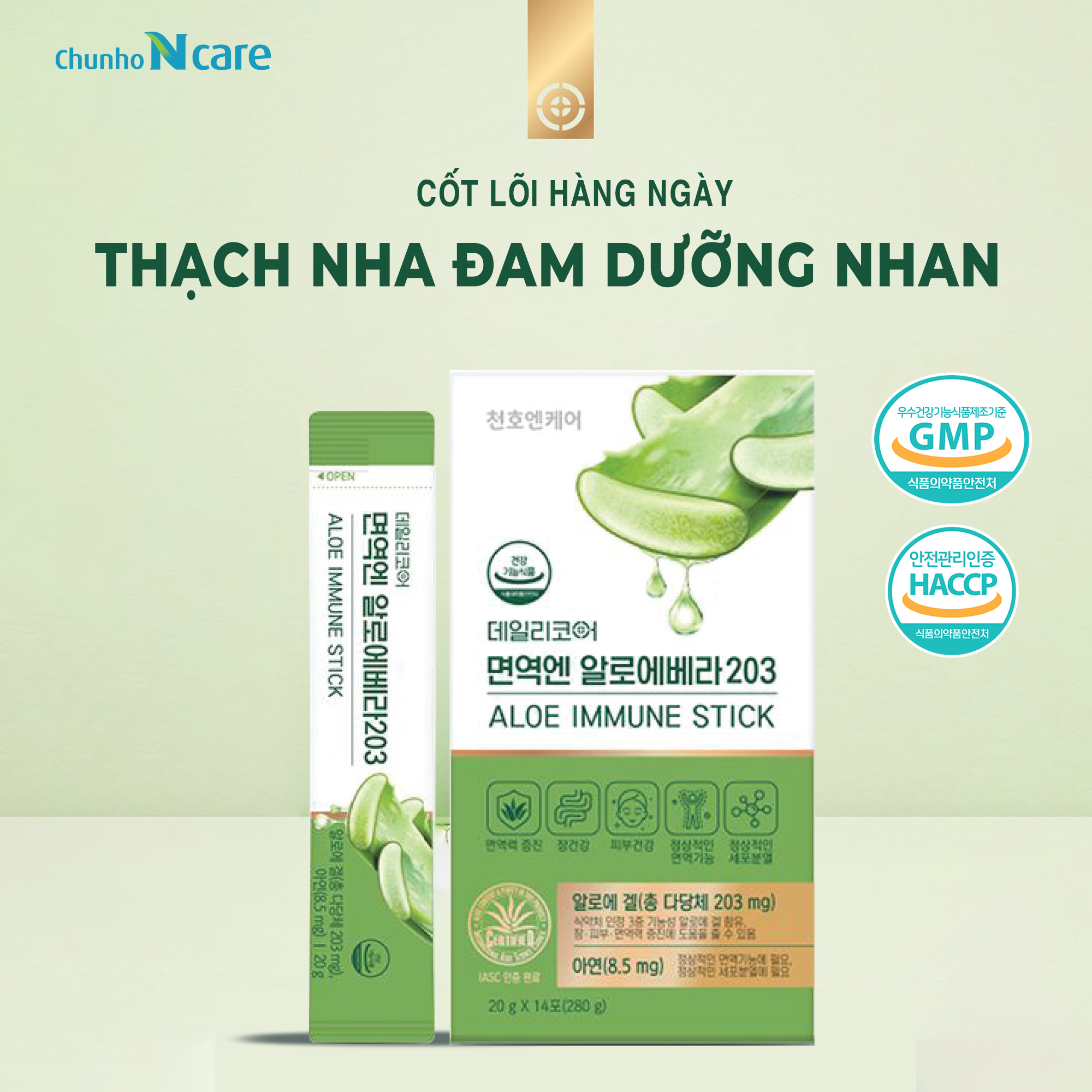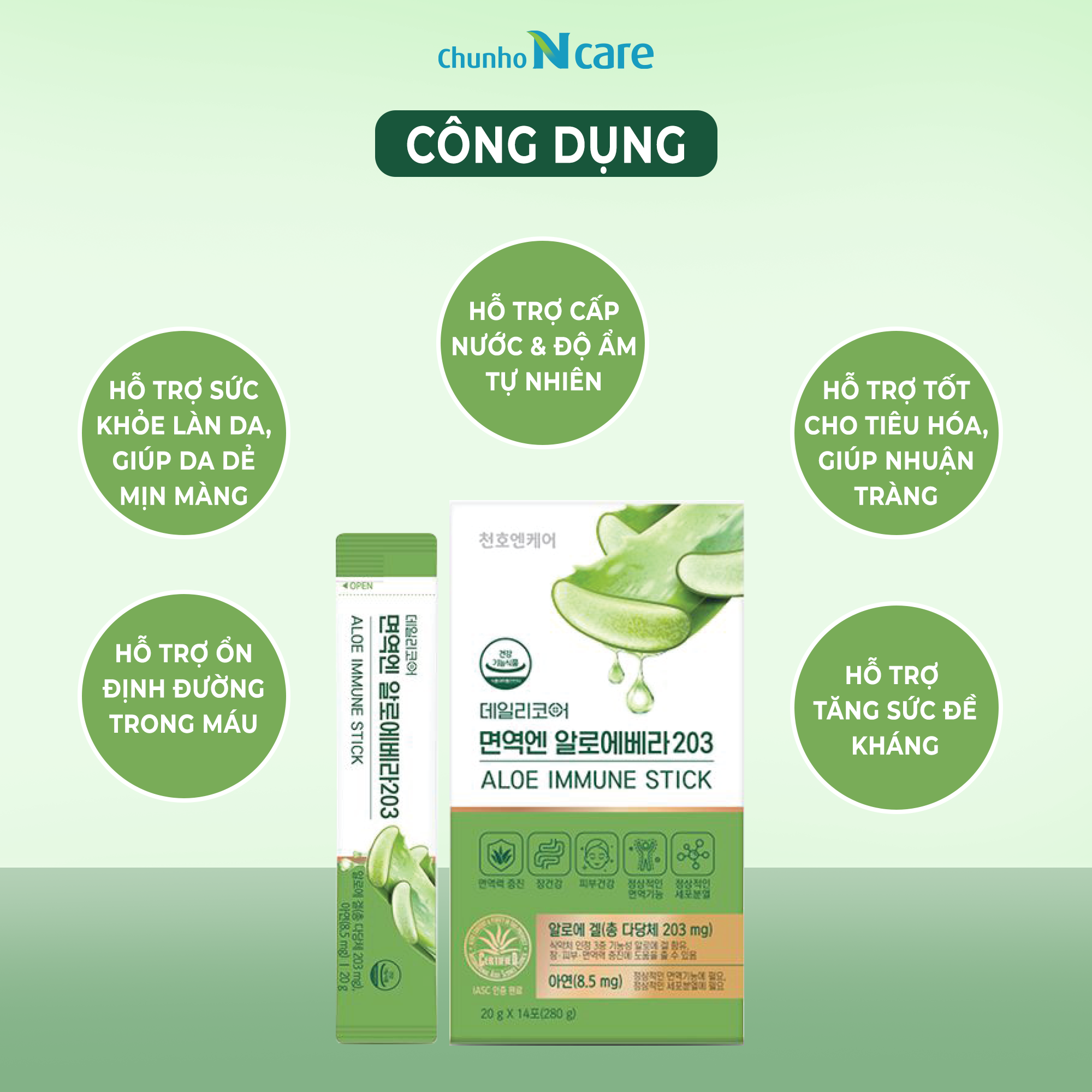 🔹 Thành phần chính: Bột đông khô gel lô hội (bột khô gel lô hội, maltodextrin, Mỹ). Fructose (đường trái cây), nước tinh khiết, nước ép nho xanh cô đặc (Chile), Fructooligosaccharides (FOS), nước ép táo cô đặc (hàng nội địa), các sản phẩm chế biến khác, tinh dầu nho xanh (hương liệu), chiết xuất brocolli phức hợp Axit citric, Xanthan gum (chất tạo đặc), cây cỏ ngọt được xử lý bằng enzym, canxi lactate, hỗn hợp vitamin (niacinamide, calcium pantothenate, vitamin B6 hydrochloride, vitamin B1 hydrochloride, vitamin B2, dextrin, folic acid, sodium citrate, citric acid, vitamin B12), kẽm gluconate.