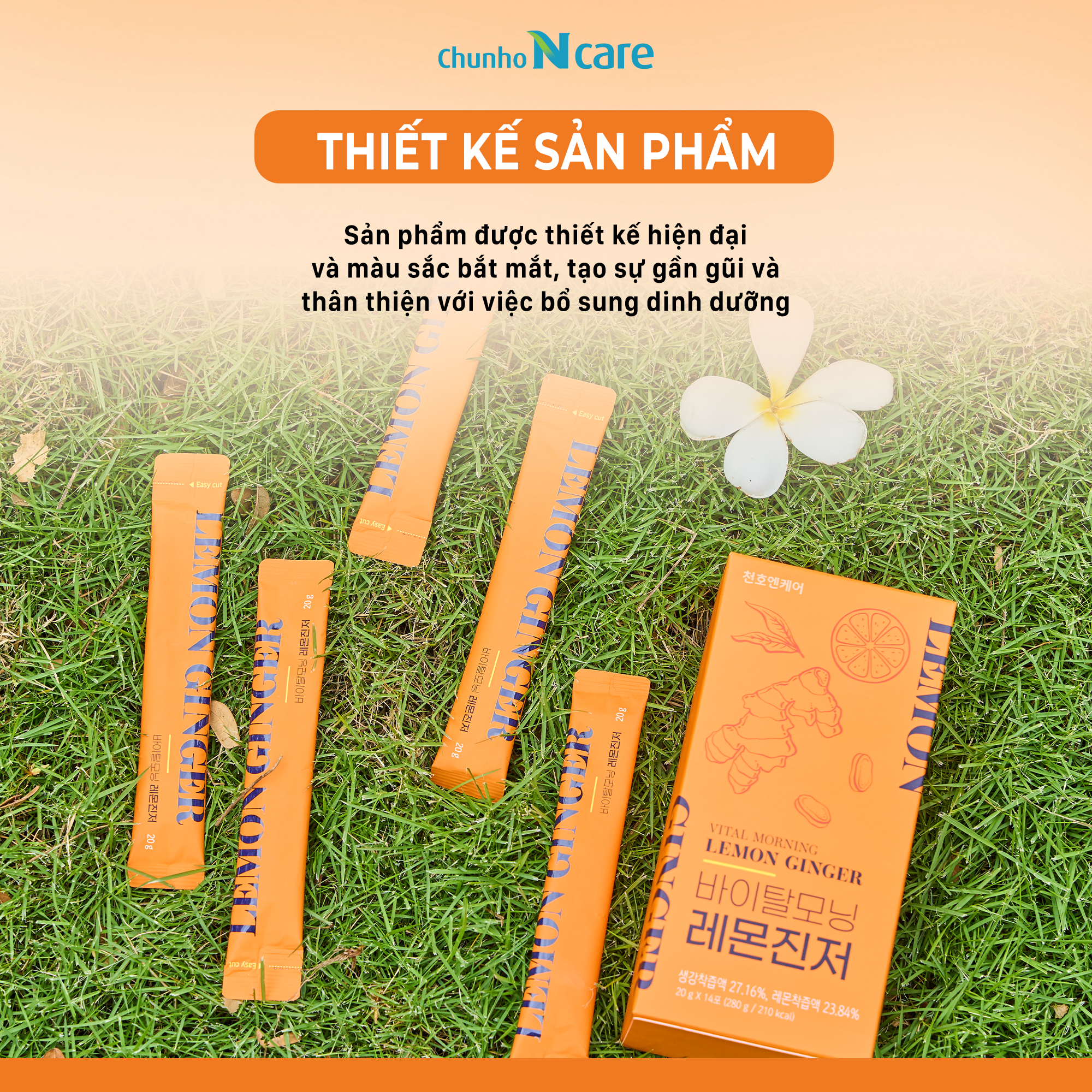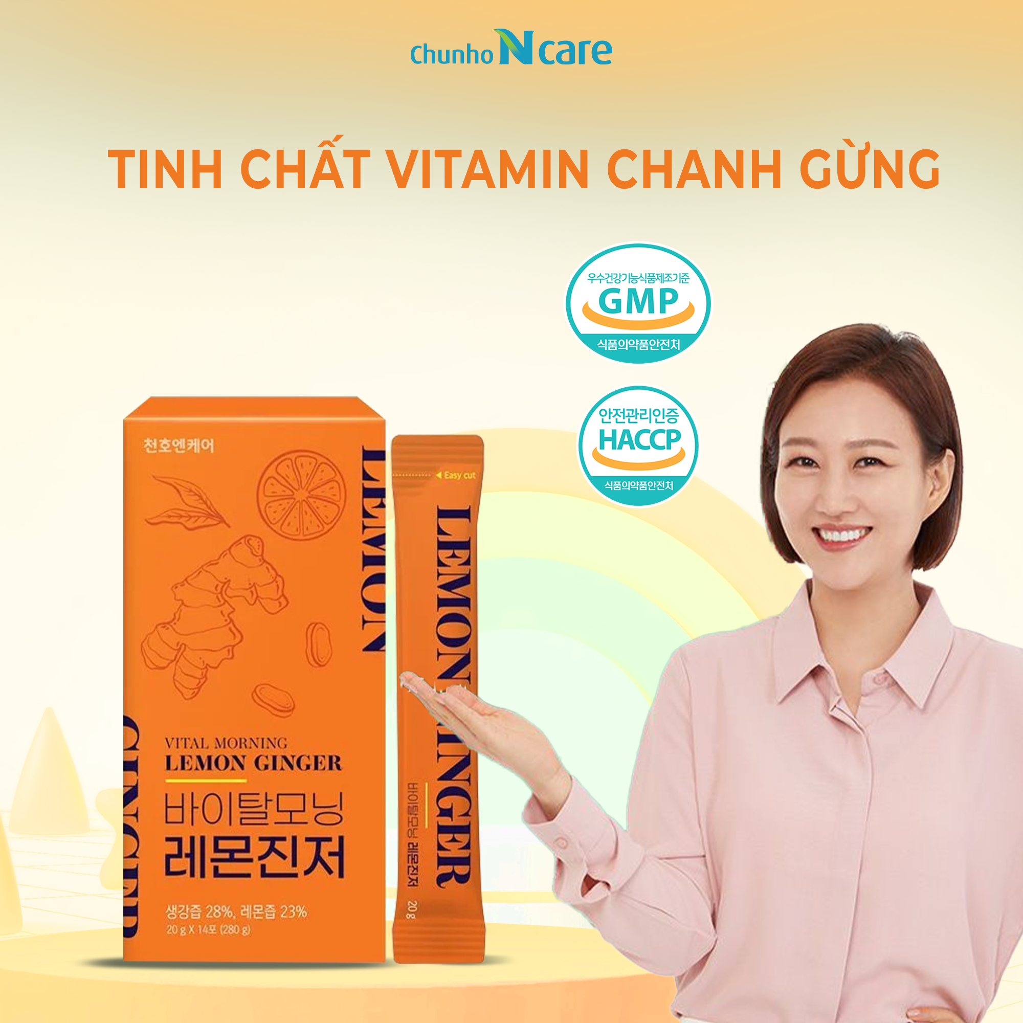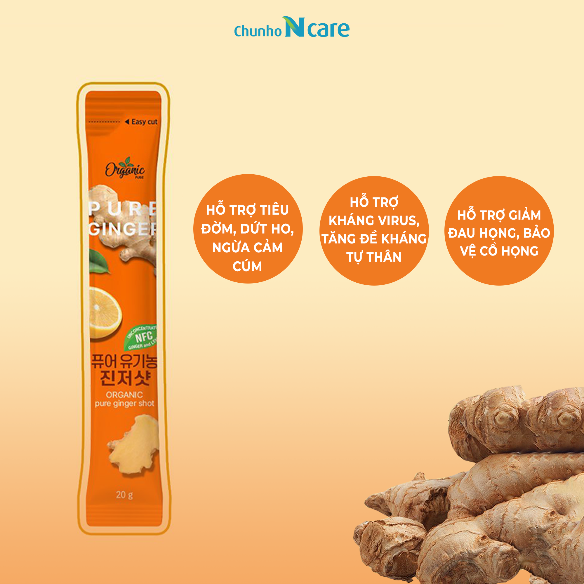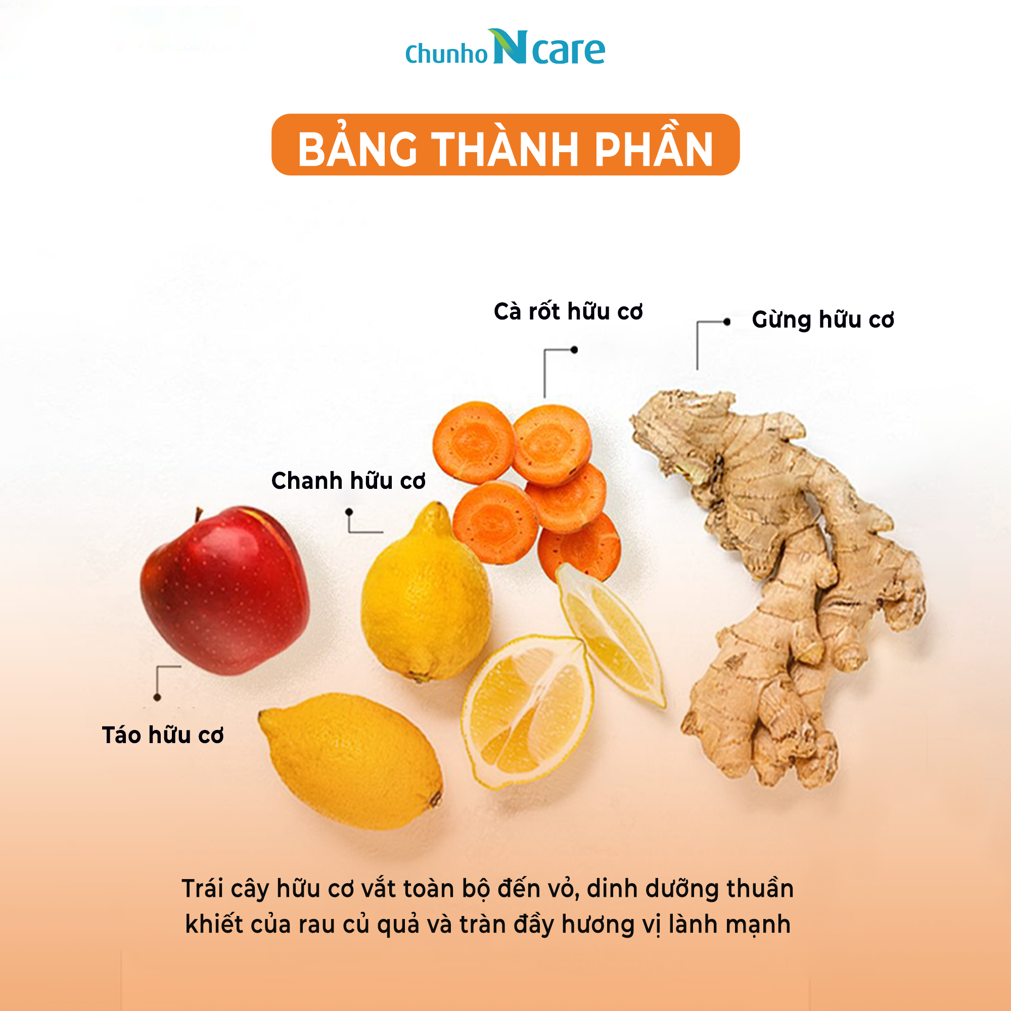 Tinh chất chanh gừng mật ongChunho Ncare có 12 loại Vitamin, gừng nhiệt đới, chanh vàng, mật ong tự nhiên… hỗ trợ giảm đờm, giảm ho, ấm họng, hỗ trợ bảo vệ hô hấp và ngừa cảm cúm
